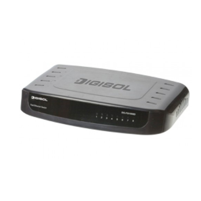 DG-FS1008D is a 10/100 Mbps Ethernet Desktop unmanaged switch designed to enhance network performance in a compact form factor. The switch comes with 8x10/100Mbps ports, offering solutions for accelerating bandwidth needs of small Ethernet workgroups. The switch uses store and forward packet-switching technology which offers reliable data transfer and supports automatic MDI/MDI-X detection & auto crossover for uplink ports which eliminates the need for cross over cables or dedicated uplink ports.